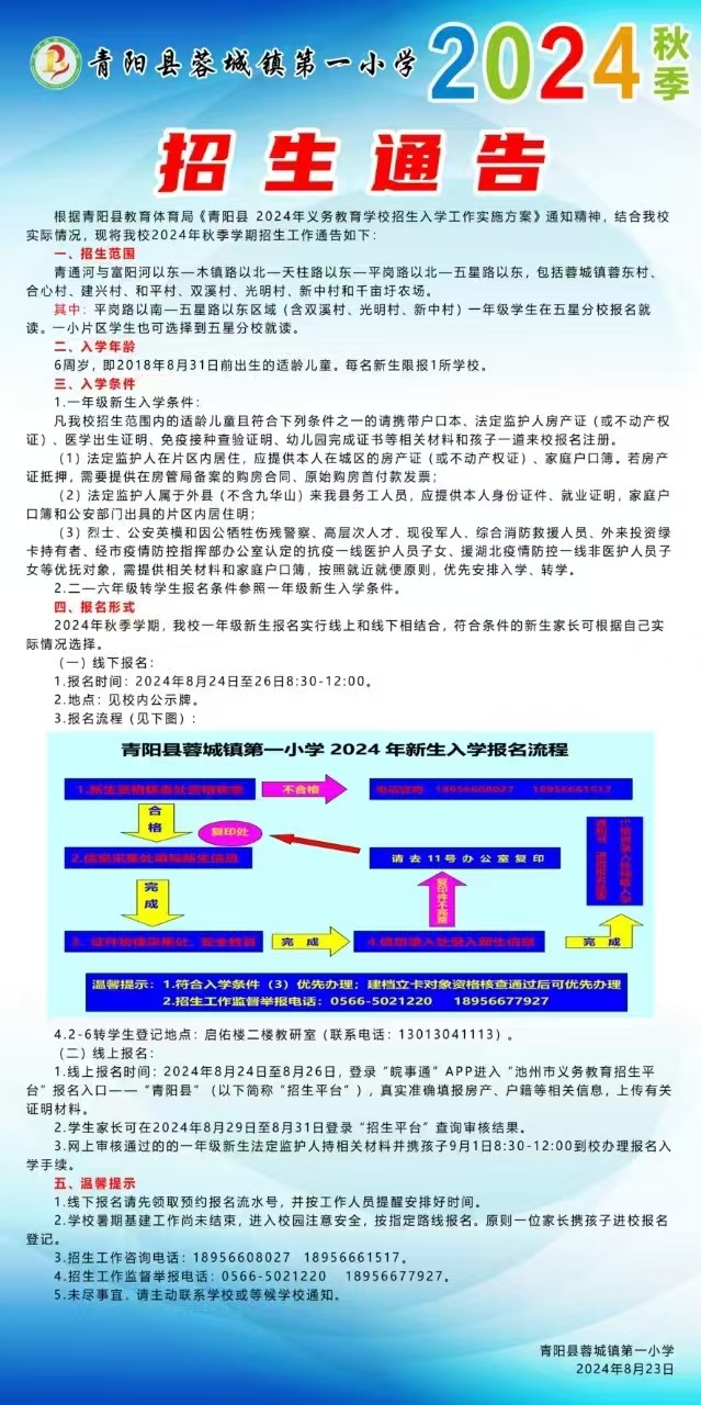 青阳县蓉城镇第一小学2024年秋季招生通告