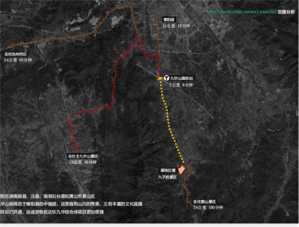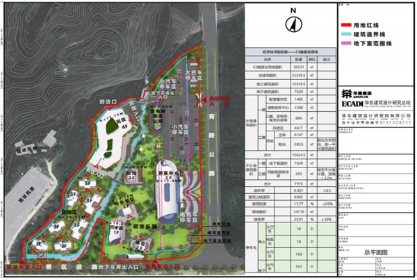 项目位于青阳县朱备镇东桥村,本次规划用地面积为35331.01平方米(约53亩集体建设用地),总建筑面积23539.5平方米,其中地上总建筑面积15919.5平方米,地下总建筑面积约为7620平方米(主要为地下停车场),容积率0.451,建筑密度17.77%,绿地率39.91%,项目配置了相应停车位(地上大巴车10个、电瓶车10个、小汽车156个;地下停车197个),满足使用需求。项目方案经第9次青阳县自然资源和规划(林长制及绿化)委员会议审议优化完善。今现根据有关规定,特对东九华文旅综合体项目修建性详细规划设计方案进行批前公示。