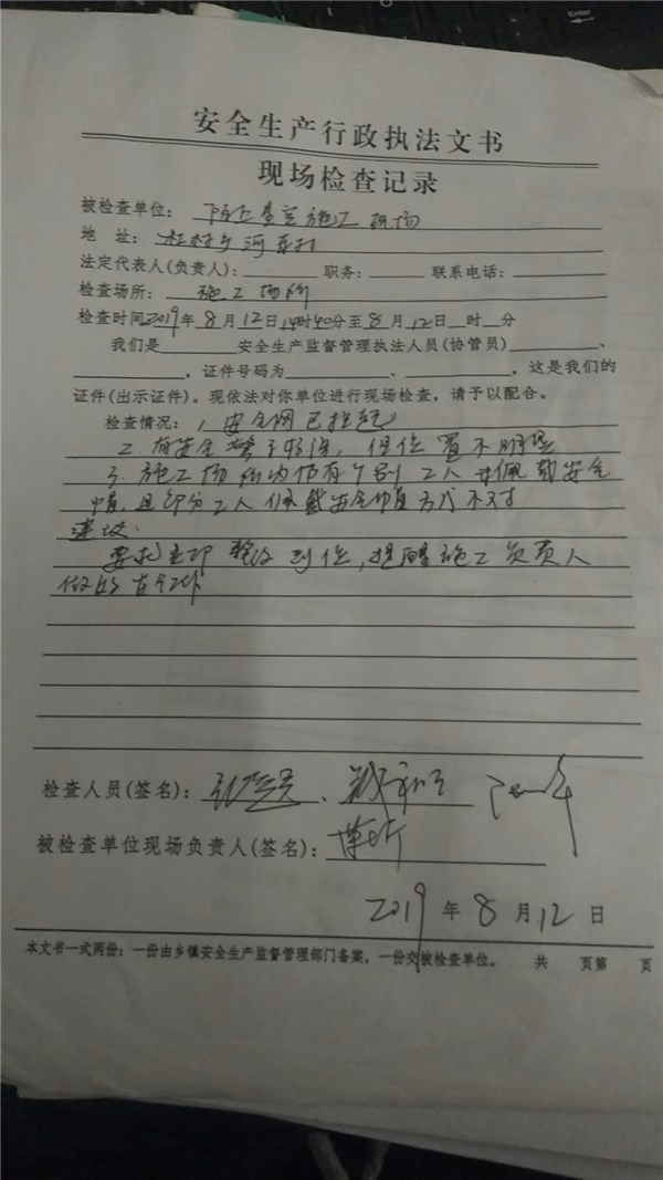 2019年杜村乡安全生产监督检查情况记录