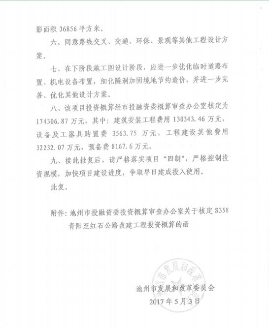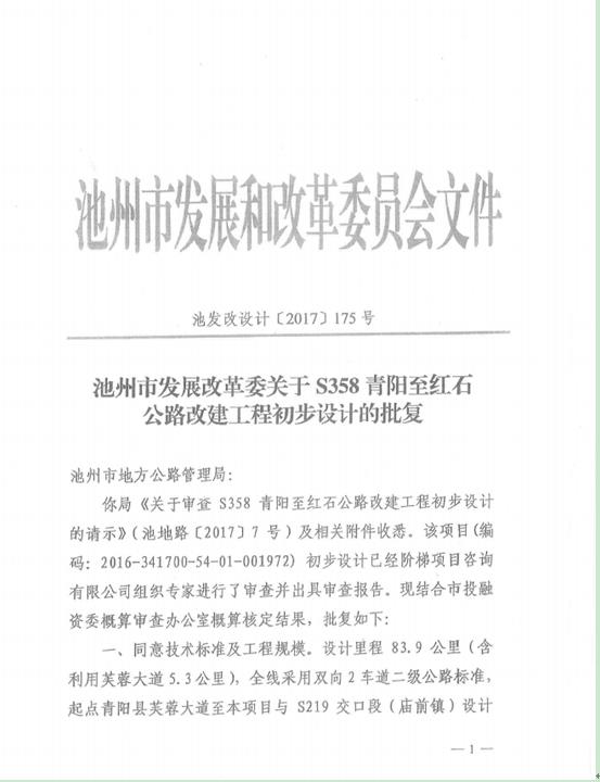 关于S358青阳至红石公路改建工程初步设计的批复