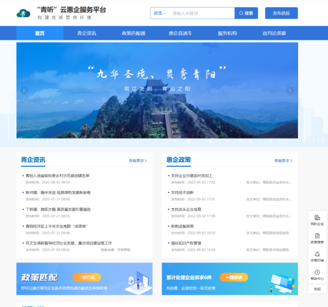 “不用自己找政策,平台会主动推过来,就像有了专属‘管家’。”提及“青听”云惠企服务平台,广宇电子办公室主任钱萍赞不绝口。为解决企业“找政策难、享政策繁”的问题,青阳县在“三个一”模式中专门打造“青听”云惠企服务平台,集成政策推送、诉求办理、融资对接等功能,让惠企服务从“企业找政策”变成“政策找企业”。