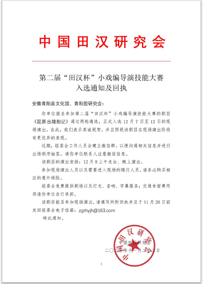 近日,从中国田汉研究会传来喜讯:由青阳县文化馆、青阳腔研究会联合报送的青阳腔剧目《屈原·出陵阳记》,经过严格的两轮遴选,成功入选第二届“田汉杯”小戏编导演技能大赛现场演出环节,将在12月7日至12日的大赛中登台亮相!
