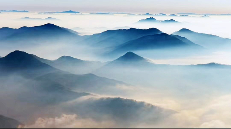 时至冬日,将军村云雾氤氲,山间云海翻涌奔腾,俨然一幅浑然天成的水墨丹青,恰似古人笔下《千里江山图》的雄浑意境。
