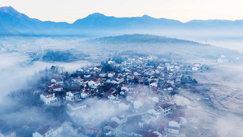 冬日清晨,青阳县庙前镇云雾笼罩,山峦、河流、田野、民居、塔影皆在云雾中若隐若现,恍若仙境。
