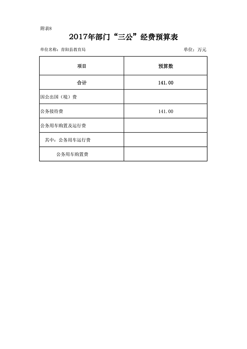 2017年,为全面反映“三公”经费支出,本次公布的“三公”经费预算为部门汇总数,包含局本级和所属中、小学,幼儿园共33个单位。2017年,“三公”经费财政拨款预算数为141万元,其中:公务接待费141万元。具体情况如下: