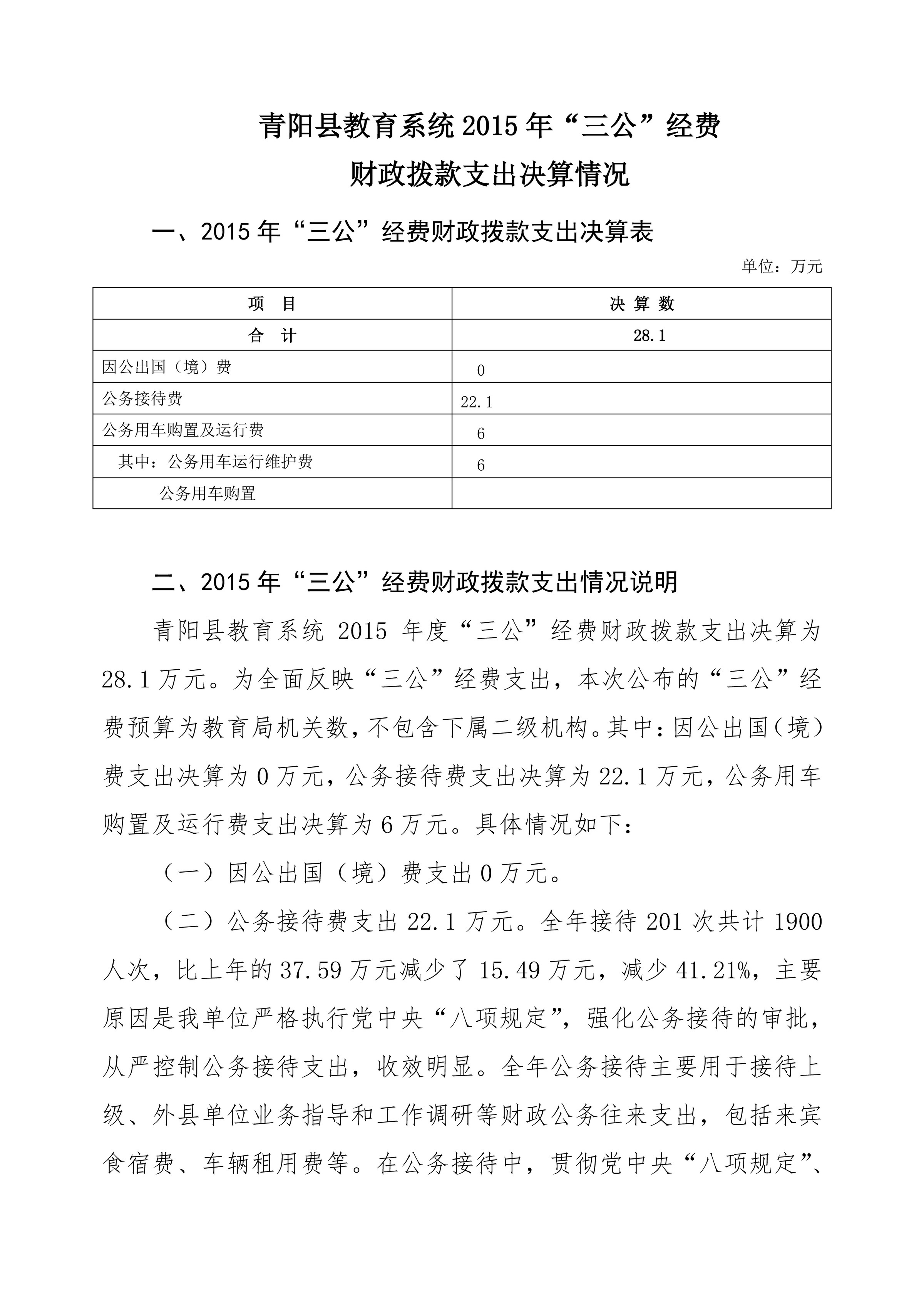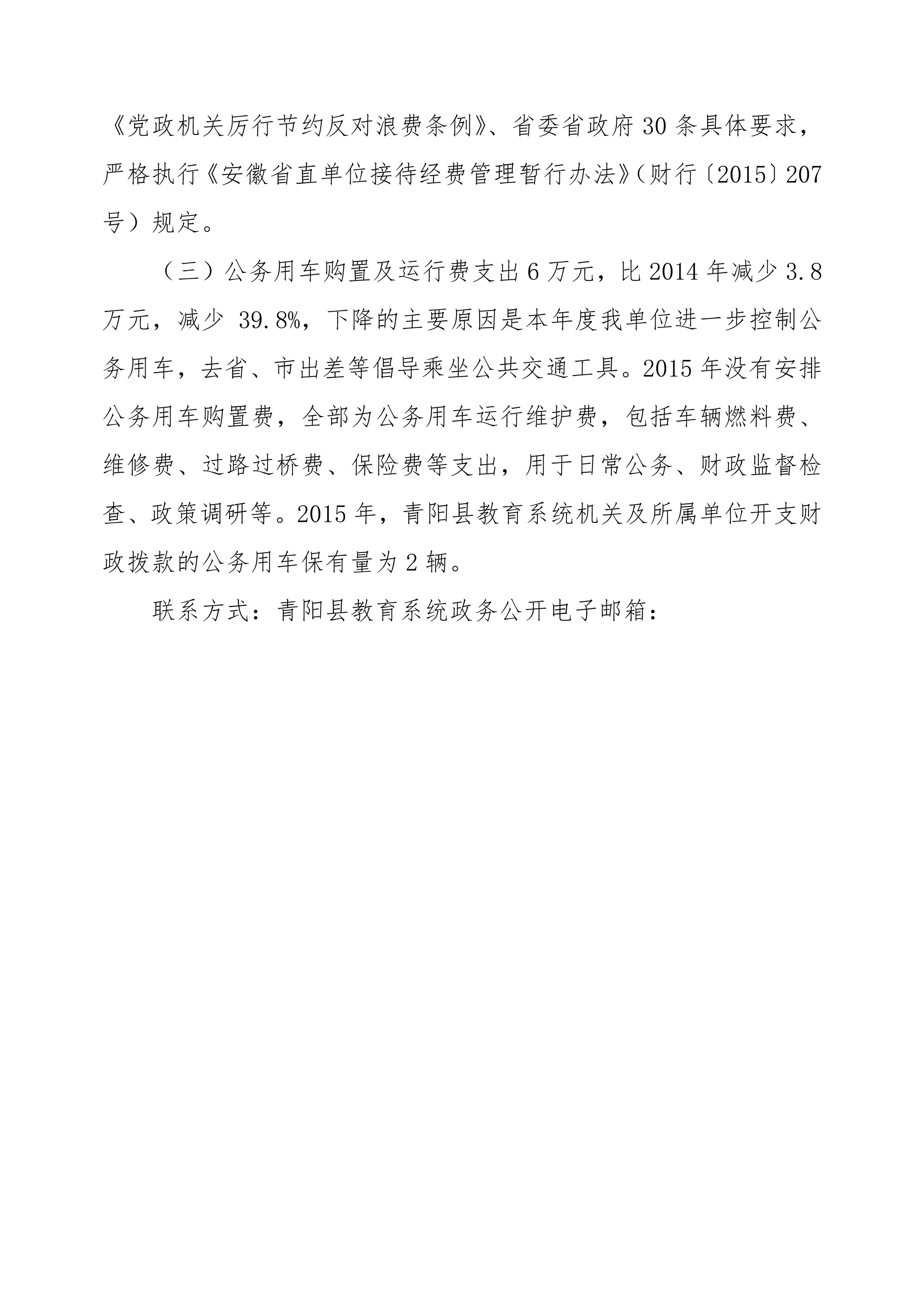 青阳县教育系统2015年“三公”经费财政拨款支出决算情况