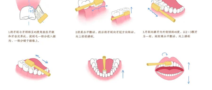 刷到前牙内侧面时,将牙刷竖起,来回上上下下,慢慢移动短距离刷,从一侧到另一侧;