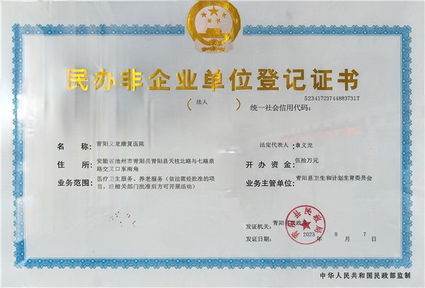 青阳义龙康复医院是中西医结合治疗骨科疾病为特色的二级康复医院。有近百年的骨伤、骨病治疗经验,拥有一批临床经验丰富、专业技术突出的医学人才。池州市和周边市、县基本医疗工伤、城乡居民医疗及多家商业保险定点医疗机构,丰富的历史积淀为我院的发展建设奠定了坚实的基础,在各级领导及社会各界人士的关心支持下,医院新院区总投资1亿元,于2020年10月正式投入使用。医院面积15000平方米,内设骨关节康复科、神经康复科、中医传统康复科、老年疼痛康复科、内科、外科、妇科、大型体检中心等。开放床位200张以上,拥有核磁共振CT、DR、胶囊胃肠镜、彩超等大型设备数十台套,十人以上高压氧舱,先进的康复医疗设备100多台套及专业康复大厅。医院环境优美,按现代化医院的要求倾力打造。同时在技术上和上海长海医院、上海同济十院、安徽省立医院等,建立了协作关系,中国康复协会会员单位。
