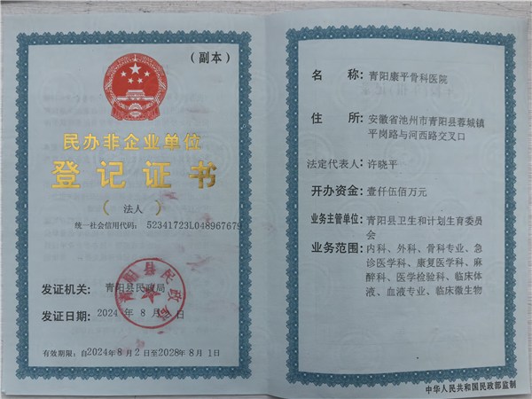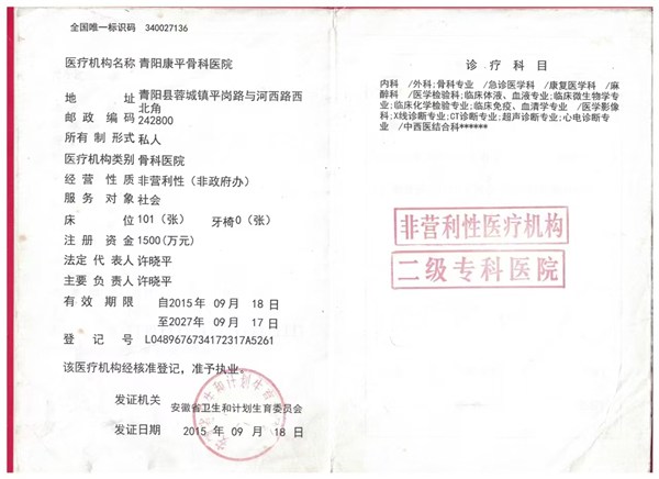 一、机构名称:青阳康平骨科医院