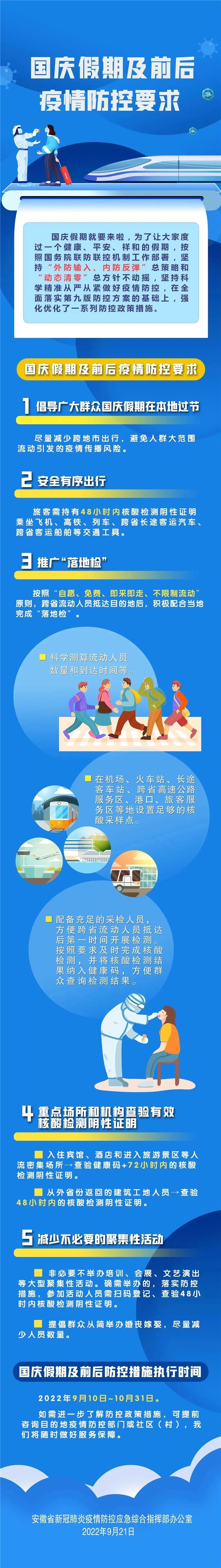 当前,国内疫情多点散发,防控形势依然严峻复杂。“国庆”长假临近,人员流动频繁,我县“外防输入、内防反弹”压力持续增大。为坚决防止疫情输入,科学精准、从严从紧落实各项防控措施,让广大市民度过一个健康、平安、祥和的节日,现就进一步强化国庆假期及前后疫情防控工作通告如下: