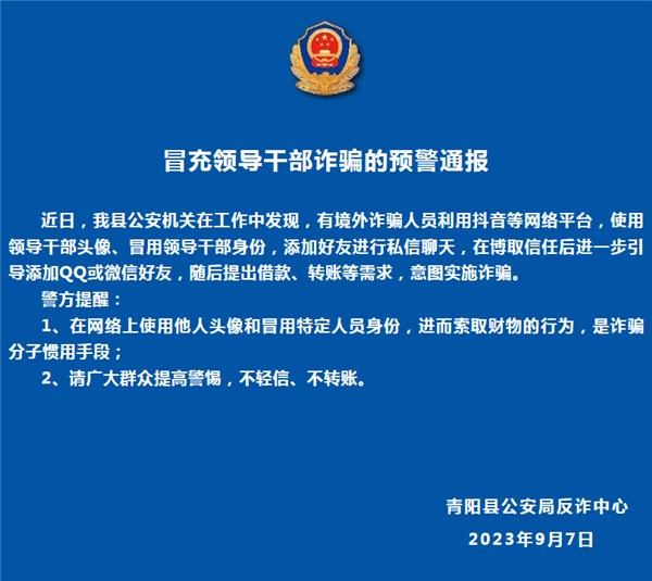 【社会安全事件类预警信息】冒充领导干部诈骗的预警通报