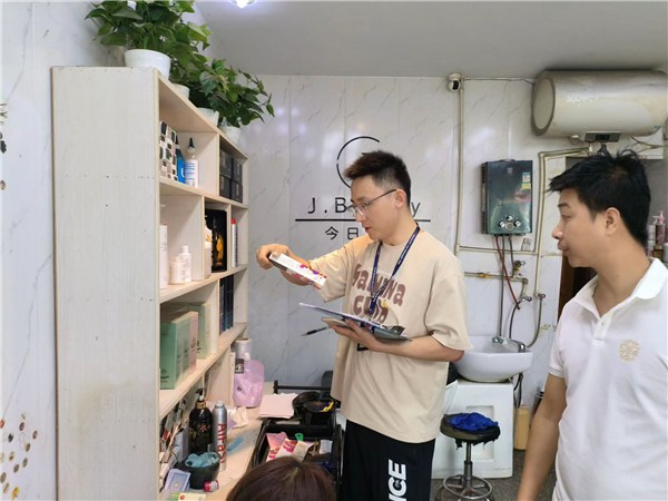 为确保染发类化妆品市场的安全,维护消费者权益,7月12日丁桥市场监管所针对辖区内的美发店、化妆品店开展染发类化妆品专项检查。