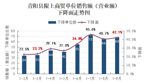 (三)限上单位下降面较大。销售额(营业额)下降的限上单位共有69家,下降面约为42.1%。限上四行业下降面分别为60.9%、45.3%、29.2%、35.9%。