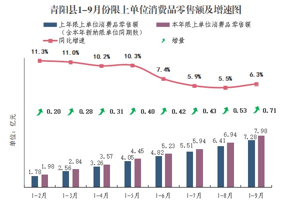 前三季度,全县社会消费品零售总额实现69.79亿元,同比增长3.8%,高于全市0.3个百分点,增速居三县一区第3位。其中:限额以上单位社会消费品零售额为7.98亿元,同比增长6.3%,高于全市平均增速5个百分点,增速居三县一区第3位。