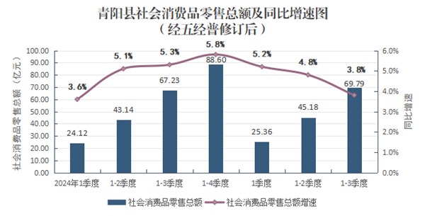 (一)从经营单位所在地看。城镇消费品零售额52.31亿元,同比增长3.8%,较去年同期下降1.4个百分点;乡村消费品零售额17.48亿元,同比增长3.9%,较去年同期下降1.5个百分点。