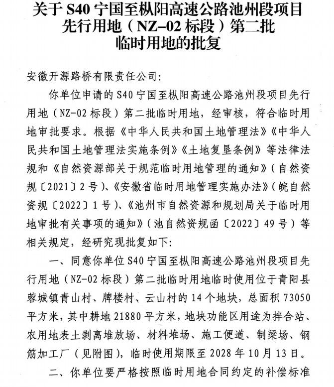 关于S40宁国至枞阳高速公路池州段项目先行用地(NZ-02标段)第二批临时用地的批复