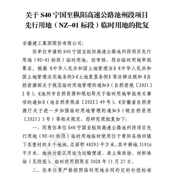关于S40宁国至枞阳高速公路池州段项目先行用地( NZ-01标段)临时用地的批复