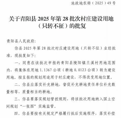 关于青阳县2025年第28批次村庄建设用地(只转不征)的批复