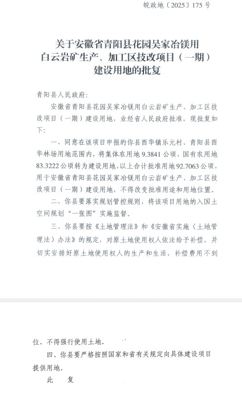 关于安徽省青阳县花园吴家冶镁用白云岩矿生产、加工区技改项目(一期)建设用地的批复