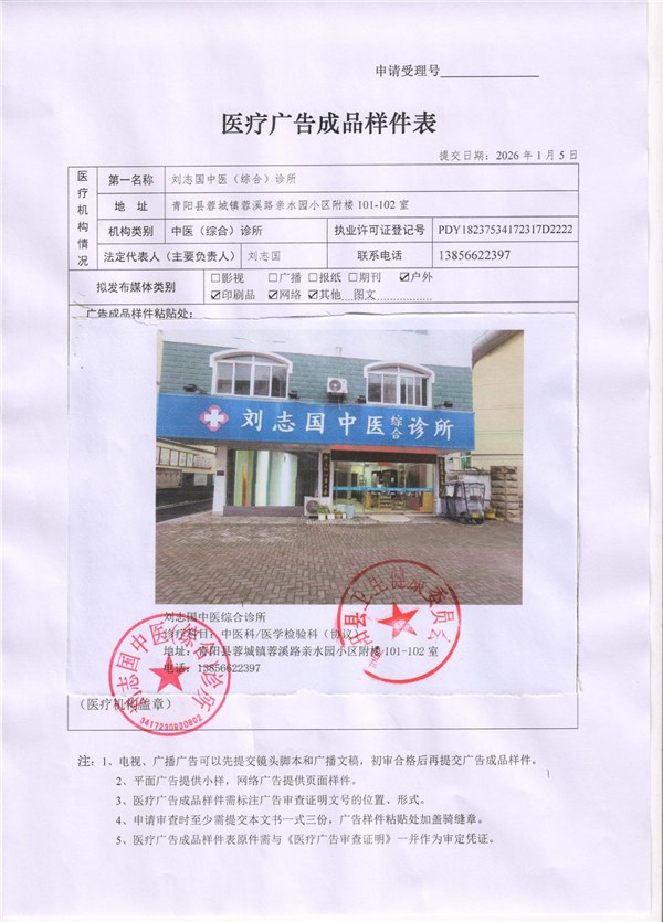 依据《医疗广告管理办法》的规定,青阳县卫生健康委员会依法受理了申请人刘志国中医(综合)诊所关于医疗广告的申请。该医疗广告审查证明公示期为自公示之日起5个工作日,公示期内任何单位或个人对以上公示信息如有异议,请在公示期内向我委反映,联系电话:0566-5021212。