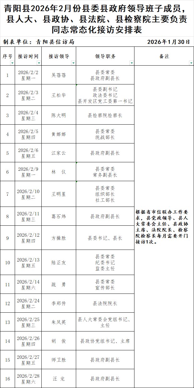 青阳县2026年2月份县委县政府领导班子成员,县人大、县政协、县法院、县检察院主要负责同志常态化接访安排表