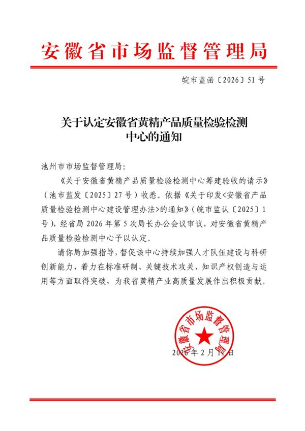 2026年2月11日,安徽省黄精产品质量检验检测中心正式通过安徽省市场监督管理局认定。