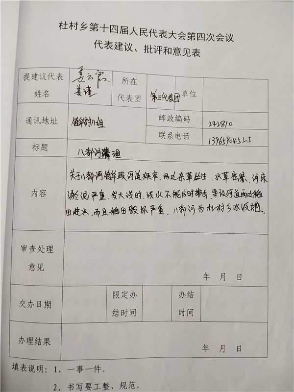 杜村乡第十四届人民代表大会第四次会议代表建议、批评和意见