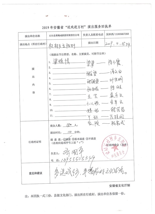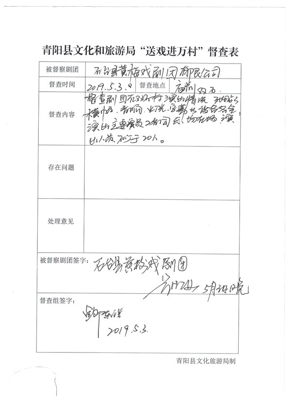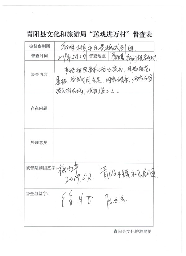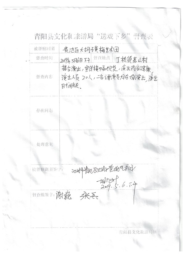 青阳县文化和旅游局加强演出监管。认真履行主体责任,强化组织领导。建立“青阳县送戏进万村微信工作群”,要求中标承演剧团每到一村演出,必须提前一天在微信工作群里发送具体演出时间、地点、剧目等信息,自觉接受监督。演出过程中,抽调10名工作人员成立“送戏进万村”督查组,制定严格的督查细则,以督察人员明查、主要领导和分管领导暗访相结合的模式,对“送戏进万村”演出进行全程监督。督查人员到场后对细则,重点检查每场演出的时间、内容、演职员数量以及接收演出地吃请情况,并当场填写督查表,双方签字,压实责任。同时现场听取观众对演出单位的演艺水平和对文化民生工程的评价和建议。每场演出结束,由承演剧团现场填写统一制式的服务回执单,经演出地行政村委会盖章后,报县文化和旅游局存档备查。