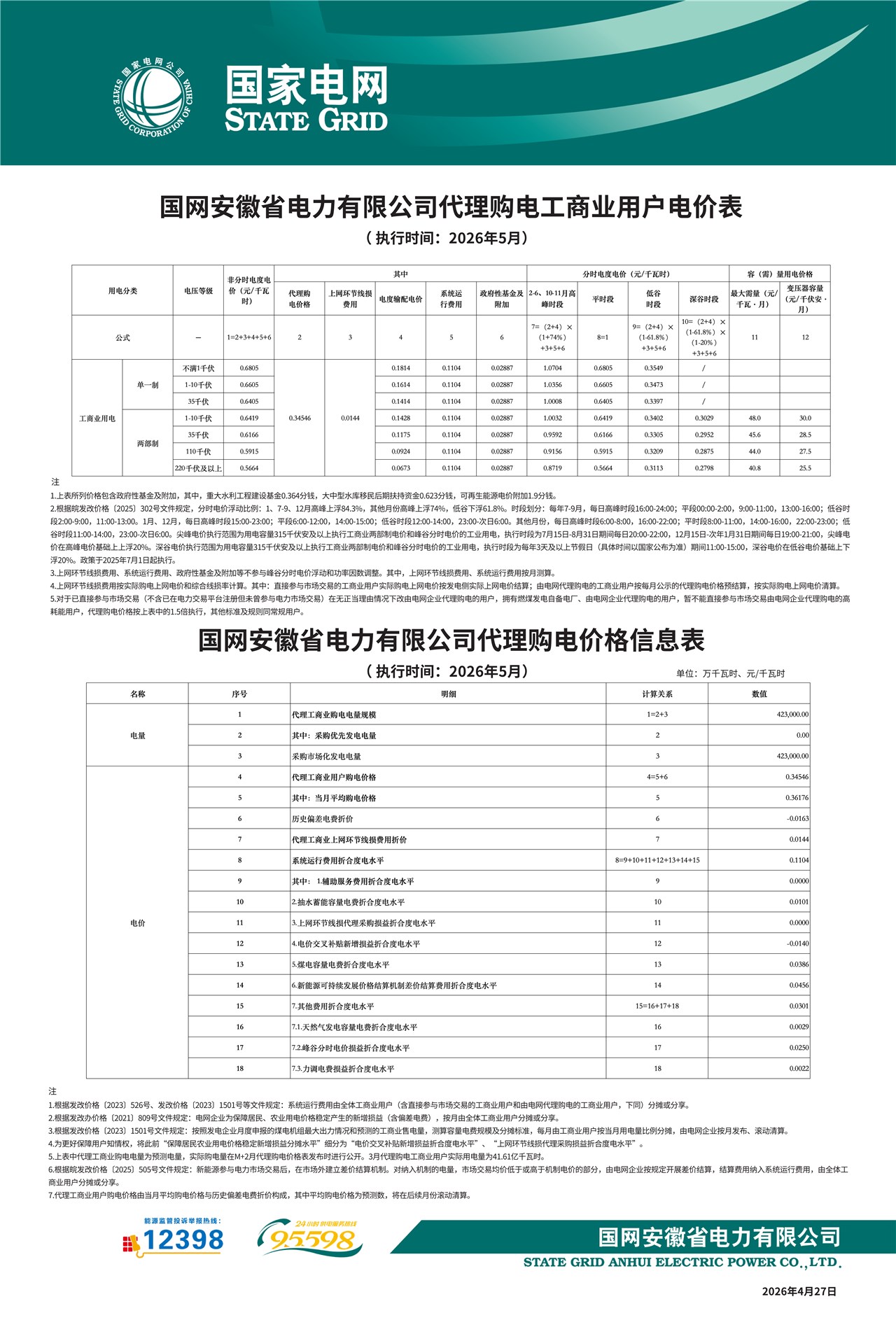 国网安徽省电力有限公司代理购电工商业用户电价表(2026年5月)